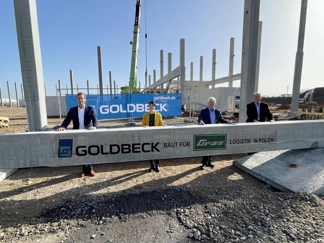 Goldbeck realisiert das 20.000 Quadratmeter große Projekt in zwei Bauabschnitten mit je 10.000 Quadratmetern Hallenfläche, acht Überladebrücken sowie einem in das Gebäude integrierten Büro-Zwischengeschoss mit 400 Quadratmetern. Die mehr als 40.000 Kubikmeter umfassenden Erdarbeiten begannen im vergangenen November. Sie waren nötig, um das 46.200 Quadratmeter große Grundstück auf ein einheitliches Niveau zu bringen. Schon bis August will Goldbeck die erste von zwei Logistikhallen fertigstellen: „Mit dem heutigen Stützenfest sind wir exakt im eng getakteten Zeitplan. Damit wir die erste Logistikhalle termin- und kostensicher im Spätsommer an die Gras Gruppe übergeben können, setzen wir auf unsere bewährte Bauweise: Wir bauen nicht Stein-auf-Stein, sondern mit System. Einen Großteil der benötigten Bauelemente, darunter auch die ca. 14 Meter hohen Betonstützen, fertigen wir in eigenen Werken vor. Auf der Baustelle werden sie anschließend in vergleichsweise kurzer Zeit zu schlüsselfertigen Gebäuden montiert,“ erklärt Marco Bayer, Leiter der Goldbeck-Niederlassung Koblenz.